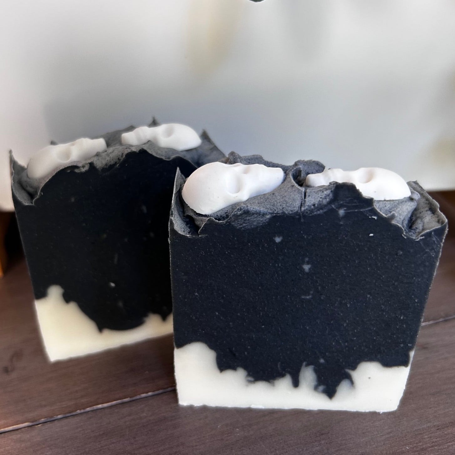 Smile, sinner — the end is near, and it smells divine. Grinning Death is a hauntingly hard salt bar carved into a wicked skull, loaded with sea salt and coconut milk for a dense, creamy lather that scrubs your sins away. Charcoal darkens the soul, while red clay, annatto seed, and gritty pumice grind down the dead weight of dull skin. A drop of honey is your only mercy. Sinfully exfoliating and eerily smooth — just the way Death likes it.