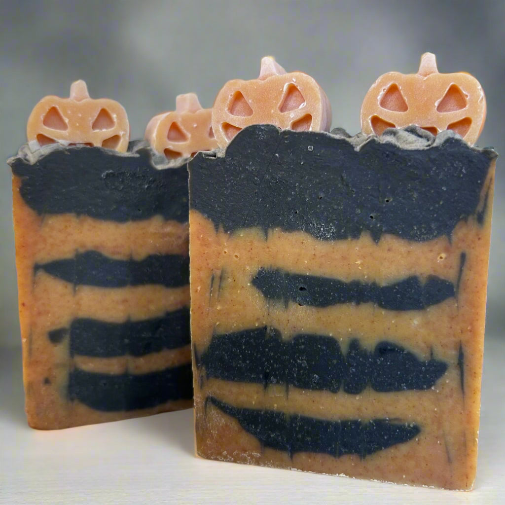 Sweet? Not in this patch. Jack’s Hollow rises from the soil with a sinister grin, swirling burnt orange and shadowed black like smoke curling from a cursed lantern. Crowned with a jack-o’-lantern who’s clearly up to no good, this bar brews an essential oil blend that’s spicy, smoky, and slightly possessed. With detoxifying clay and charcoal beneath the surface, it scrubs away your sins — or at least hides the evidence. Wash with caution. The Hollow is watching. Scented with earthy patchouli, cedarwood, and sweet orange.