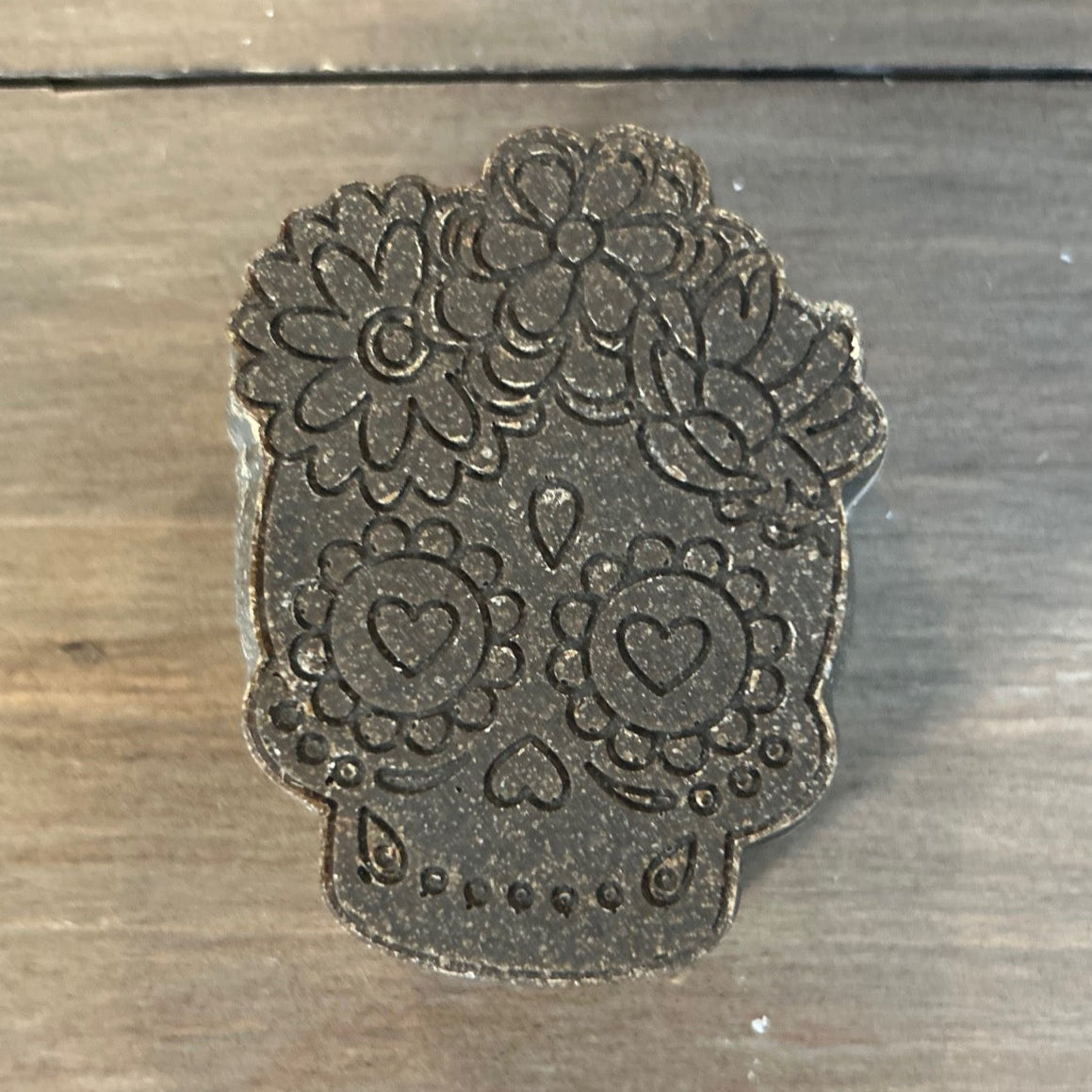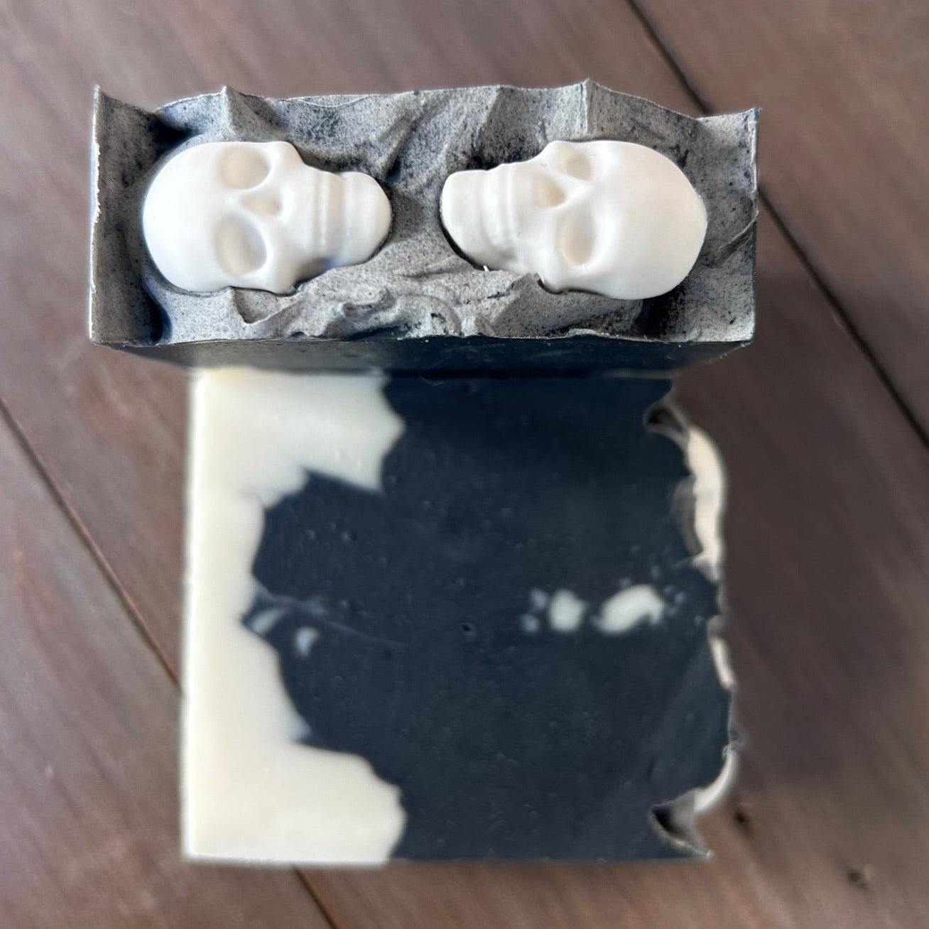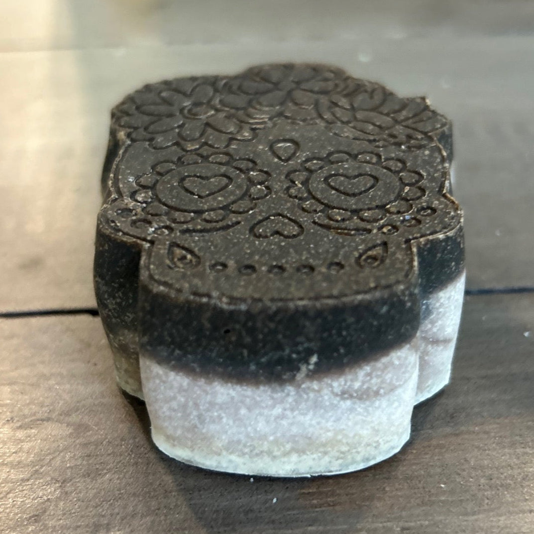 A skull-shaped bar scented with smooth vanilla, bright orange, and grounding sandalwood.