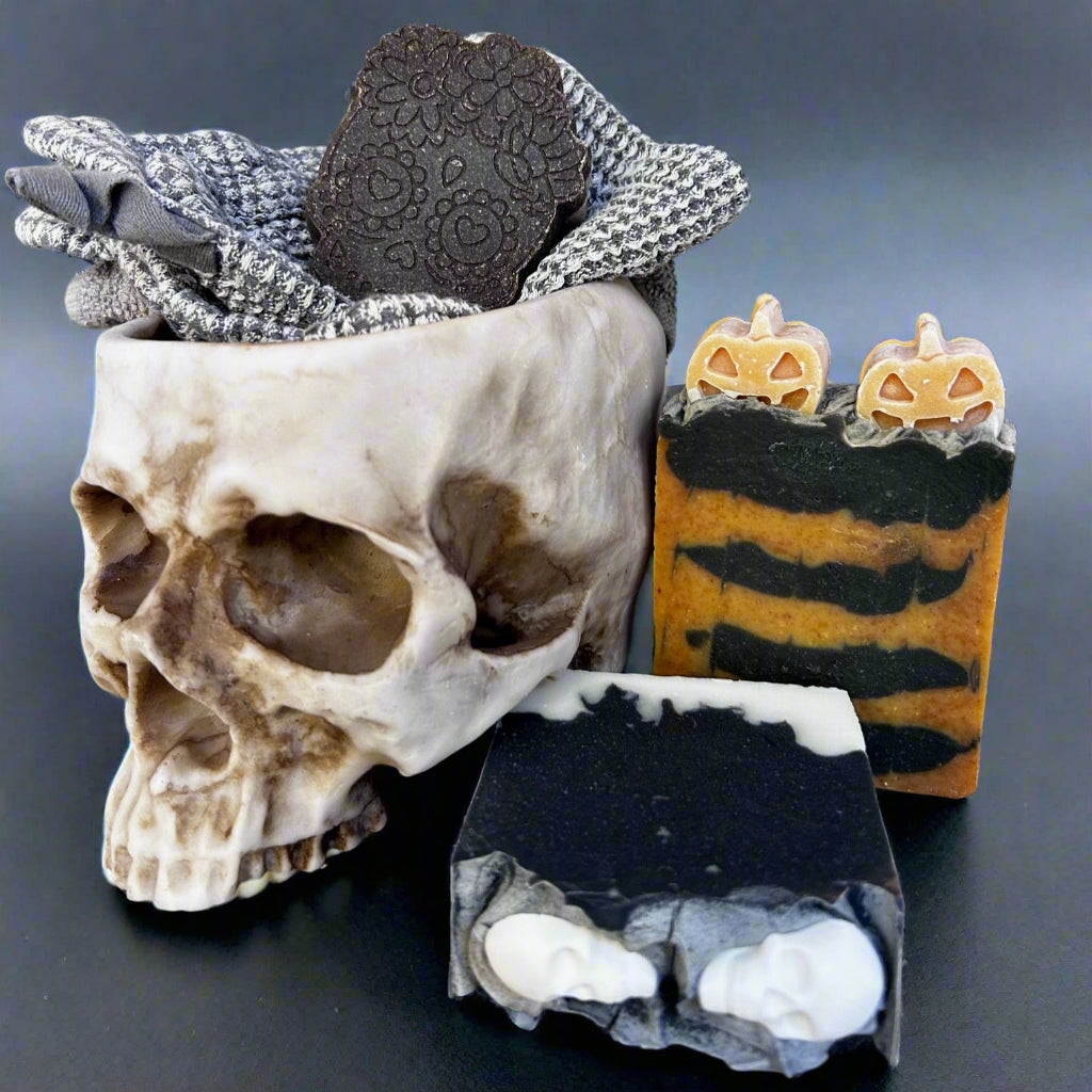 The Haunted Bloom Set is a limited-edition trio of gothic soaps brewed for those who bathe in moonlight and bloom in the shadows. Skulls, pumpkins, and graveyard flowers crown these cursed bars, each scented with an essential oil blend that whispers of dirt, smoke, spice, and secrets. Come scrub among the dead — Lilith is waiting.